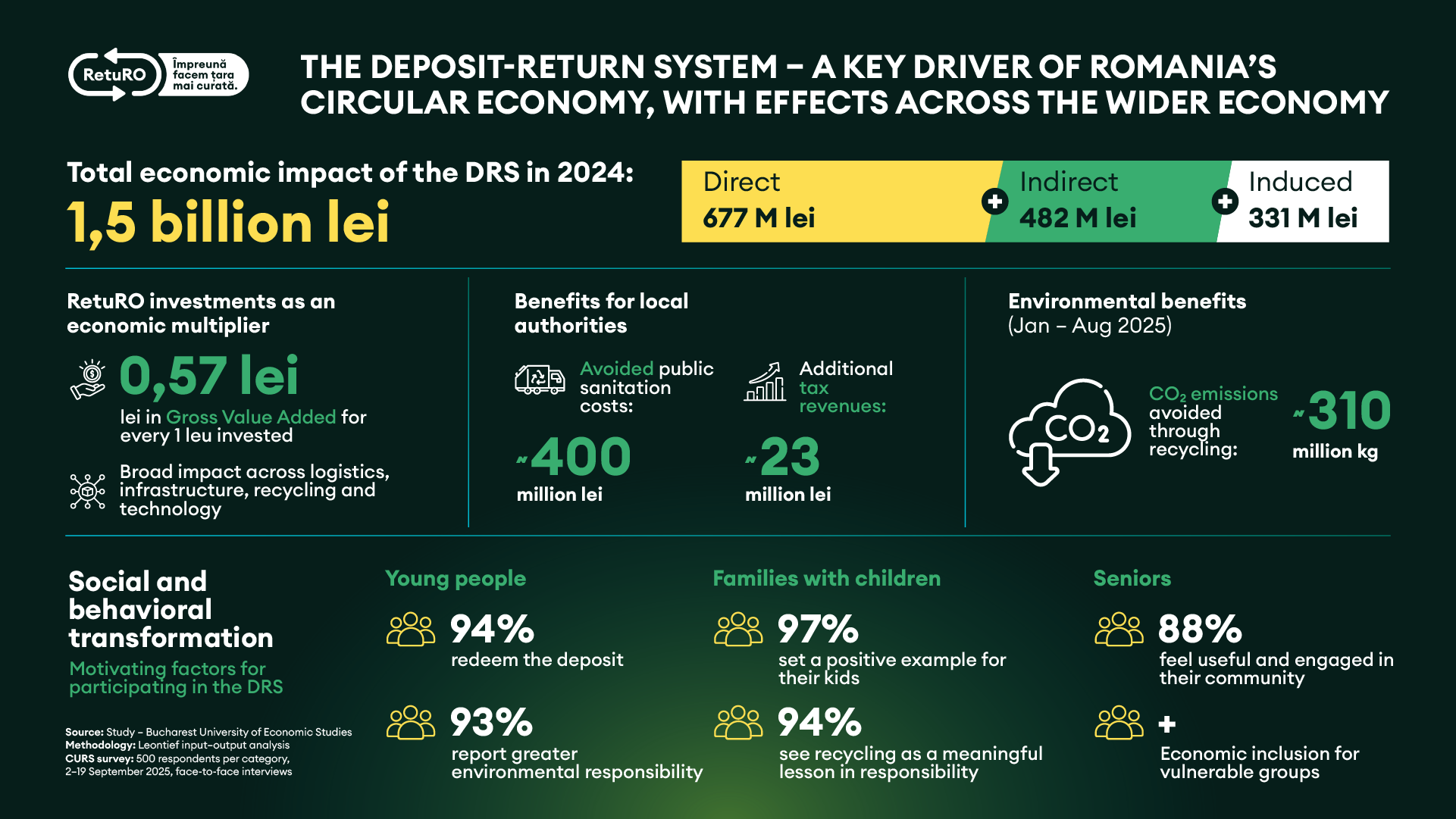 The Deposit-Return System (DRS) administered by RetuRO produced a total economic impact of 1.49 billion lei in 2024, according to a study by the Bucharest University of Economic Studies. The combined direct, indirect and induced contributions position the system as one of Romania’s most substantial circular-economy mechanisms, activating producers, retailers, recyclers and local administrations across the national value chain.